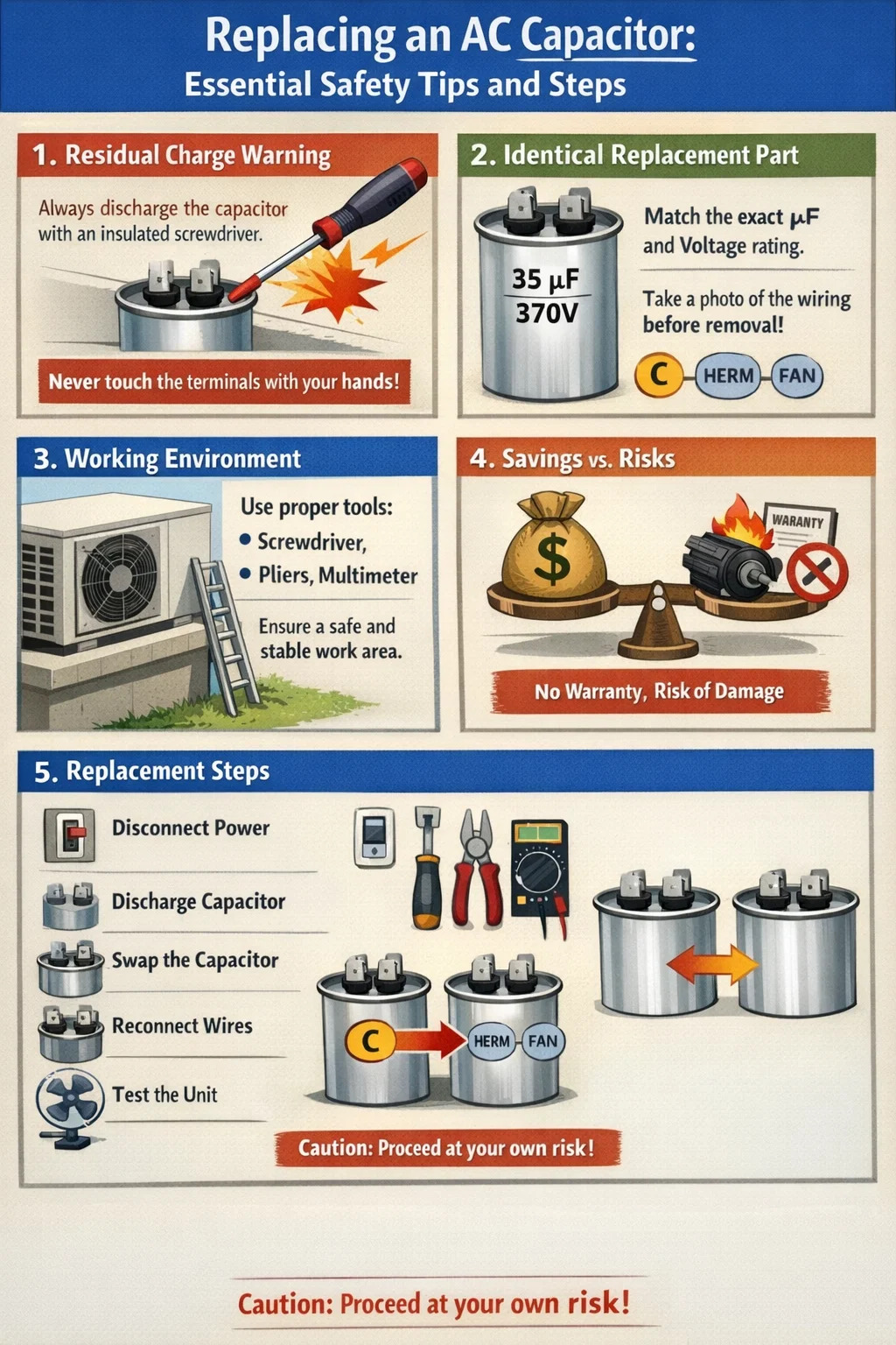 Mnoho ľudí, ktorí vidia, aká jednoduchá je štruktúra an AC kondenzátor chcú ho vymeniť sami, aby ušetrili mzdové náklady. Odpoveď znie: áno, môžete, ale musíte byť veľmi opatrní.