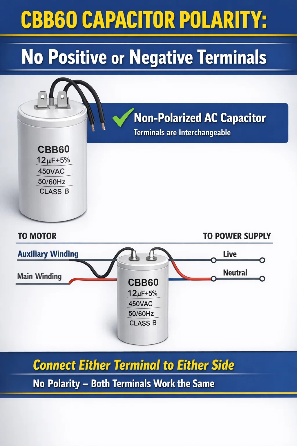 Kondenzátor CBB60 je ani pozitívne, ani negatívne . Je to nepolarizovaný AC kondenzátor, čo znamená, že nemá určený kladný alebo záporný pól. Ktorýkoľvek terminál môžete pripojiť na ktorúkoľvek stranu obvodu bez akéhokoľvek rizika poškodenia alebo poruchy. Toto je jedna z najzákladnejších charakteristík, ktorá ho odlišuje od elektrolytických kondenzátorov, ktoré sú prísne polarizované a pri nesprávnom zapojení zlyhajú – alebo dokonca explodujú.