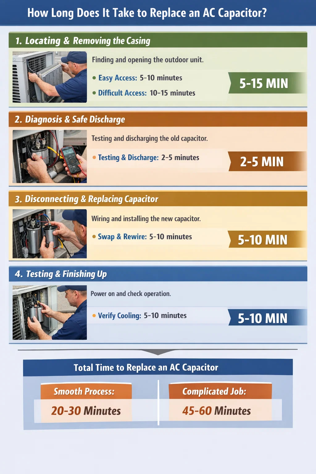 Ako dlho vlastne trvá výmena AC kondenzátor ? Ak sledujete iba niekoľko minút, kedy technik pracuje, možno si myslíte, že práca je prekvapivo rýchla. Ale od chvíle, keď príde technik, kým klimatizácia opäť nezačne fúkať studený vzduch, prebieha celý proces.