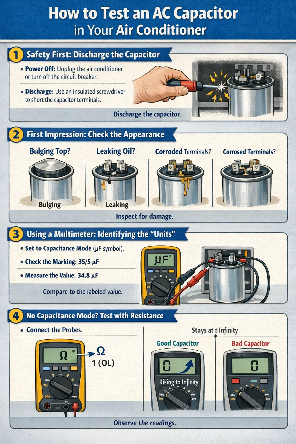 Určenie, či je AC kondenzátor v klimatizácii dobrý alebo zlý, si nevyžaduje odborné znalosti v oblasti elektroniky. Pokiaľ máte multimeter s funkciou "test kapacity", môžete postupovať podľa týchto krokov a stať sa poloodborníkom.