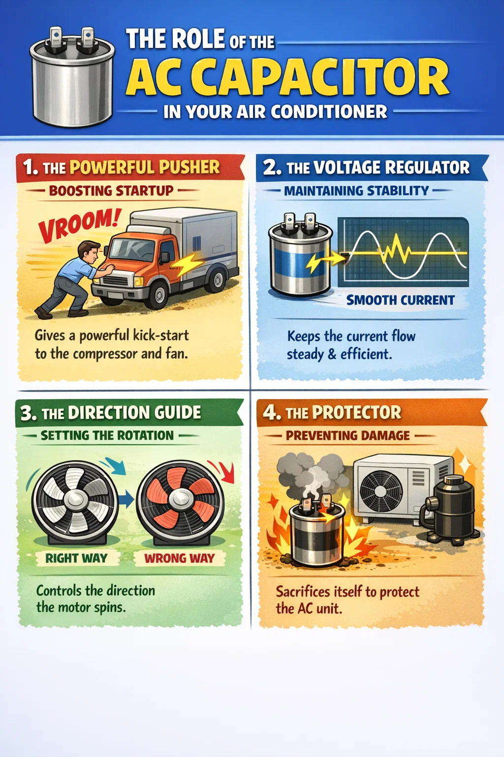 Udržiavanie rovnováhy: Prúd niekedy počas prenosu kolíše. Kondenzátor funguje ako vyrovnávacia pamäť, vďaka čomu je prúd vstupujúci do kompresora stabilnejší.