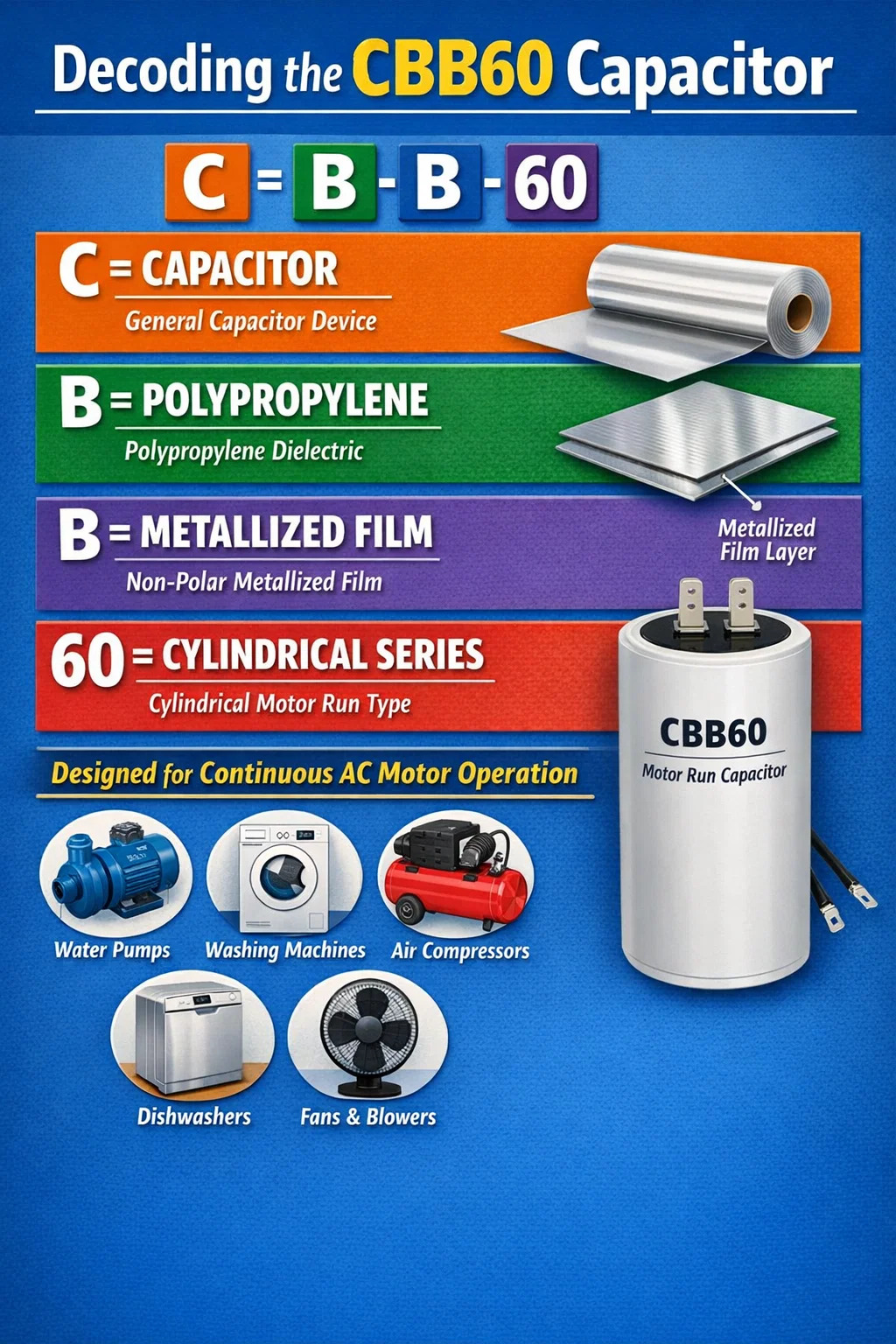 A kondenzátor CBB60 je nevyhnutný pre jednofázové indukčné motory. Pretože jednofázový zdroj striedavého prúdu prirodzene nevytvára rotujúce magnetické pole, motor by jednoducho sedel a vibroval bez pomoci kondenzátora. CBB60 vytvára sekundárne magnetické pole oneskorením prúdu v pomocnom vinutí.
