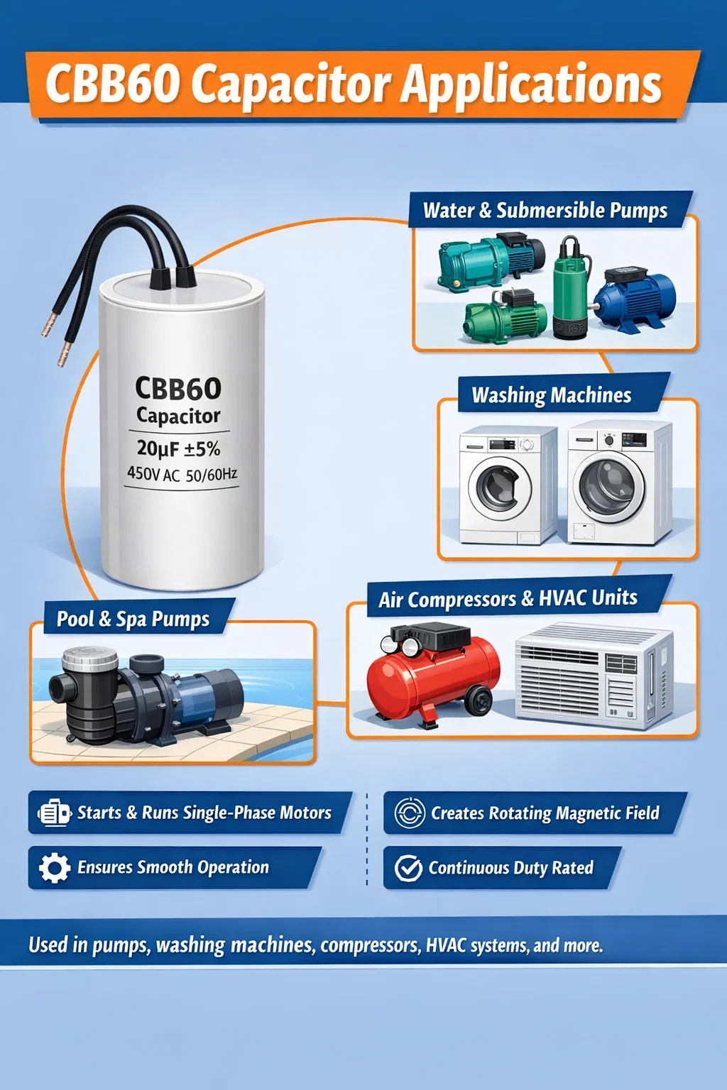 Obehové čerpadlá pre bazény a kúpele, čerpadlá pre zavlažovacie systémy, motory na spracovanie obilia, malé sústruhy a dokonca aj niektoré chladiace kompresory v komerčných chladičoch využívajú kondenzátory CBB60. Akákoľvek aplikácia s jednofázovým indukčným motorom s permanentným deleným kondenzátorom (PSC) alebo s rozbehovým kondenzátorom (CSCR) môže potenciálne použiť CBB60 v prevádzkovej polohe.