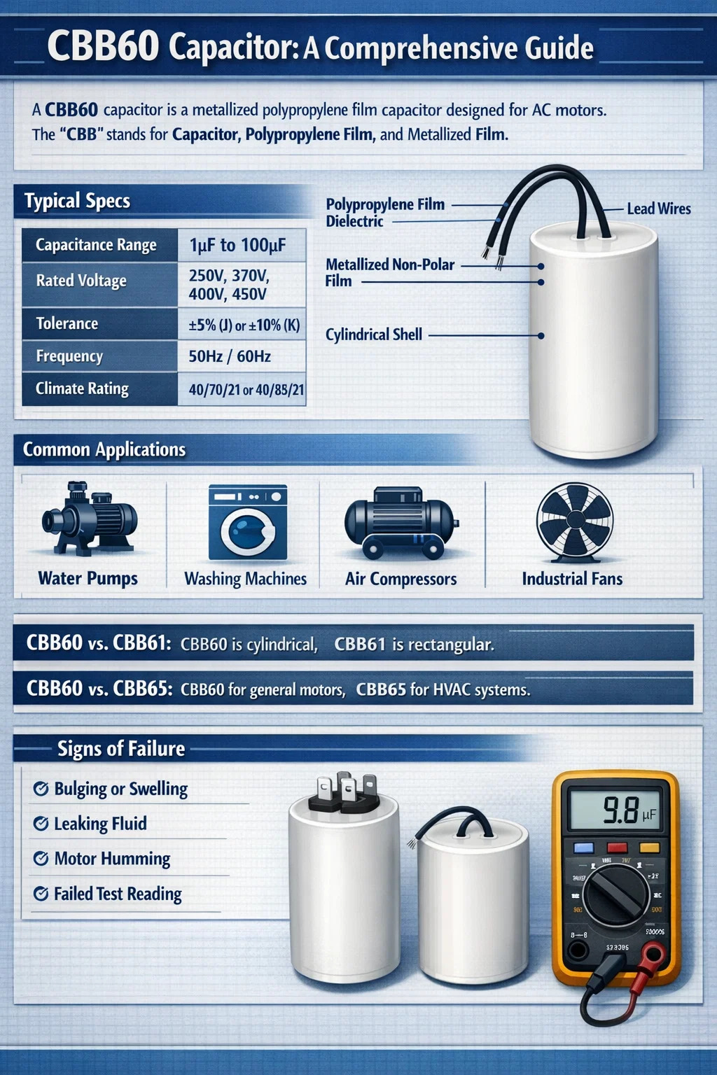 A kondenzátor CBB60 je špecializovaný typ kondenzátora s metalizovanou polypropylénovou fóliou určený predovšetkým pre aplikácie striedavých motorov. Označenie „CBB“ znamená jeho materiálové zloženie: „C“ pre kondenzátor, „B“ pre dielektrikum polypropylénovej fólie a druhé „B“ pre nepolárny metalizovaný film. Tieto kondenzátory sú oficiálne klasifikované ako prevádzkové kondenzátory, čo znamená, že zostávajú v obvode počas prevádzky motora, aby sa zachoval krútiaci moment a zlepšila sa účinnosť.