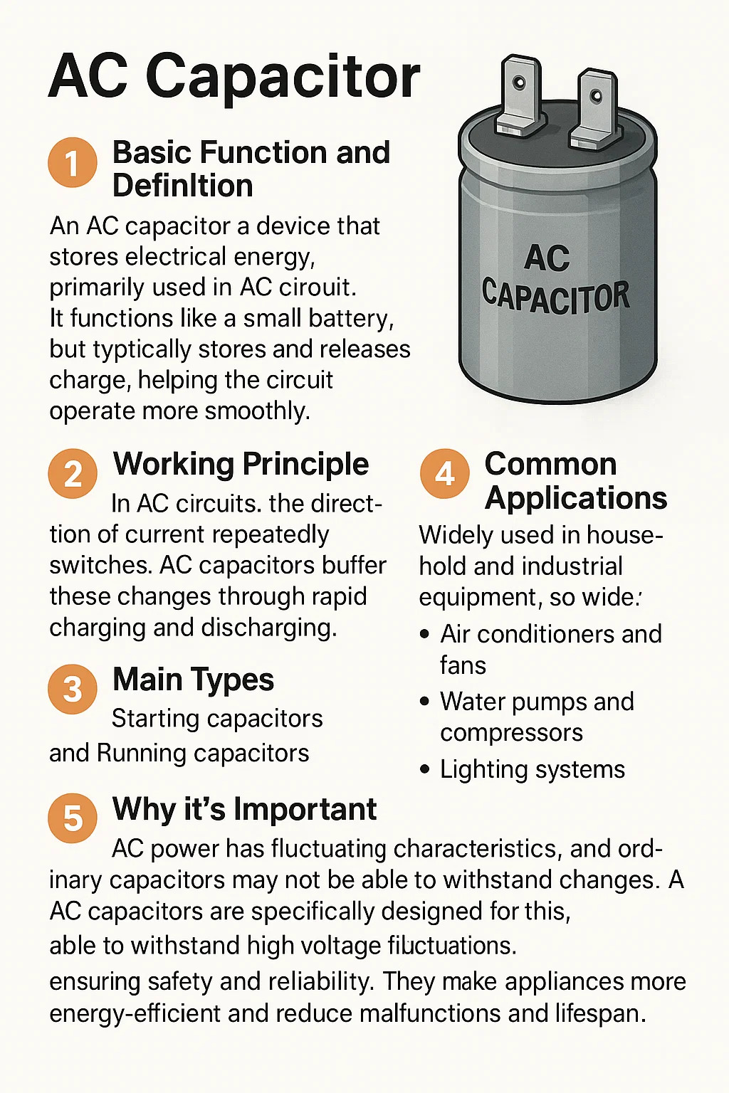 AC kondenzátor je zariadenie, ktoré uchováva elektrickú energiu, používa sa predovšetkým v obvodoch striedavého prúdu. Funguje ako malá batéria, ale funguje inak – nevyrába elektrinu; namiesto toho dočasne ukladá a uvoľňuje náboj, čím pomáha obvodu fungovať plynulejšie. Zatiaľ čo bežné kondenzátory môžu byť použité v DC zariadeniach, AC kondenzátory sú špeciálne navrhnuté pre charakteristiky striedavého prúdu, pretože smer a veľkosť striedavého prúdu sa neustále menia.